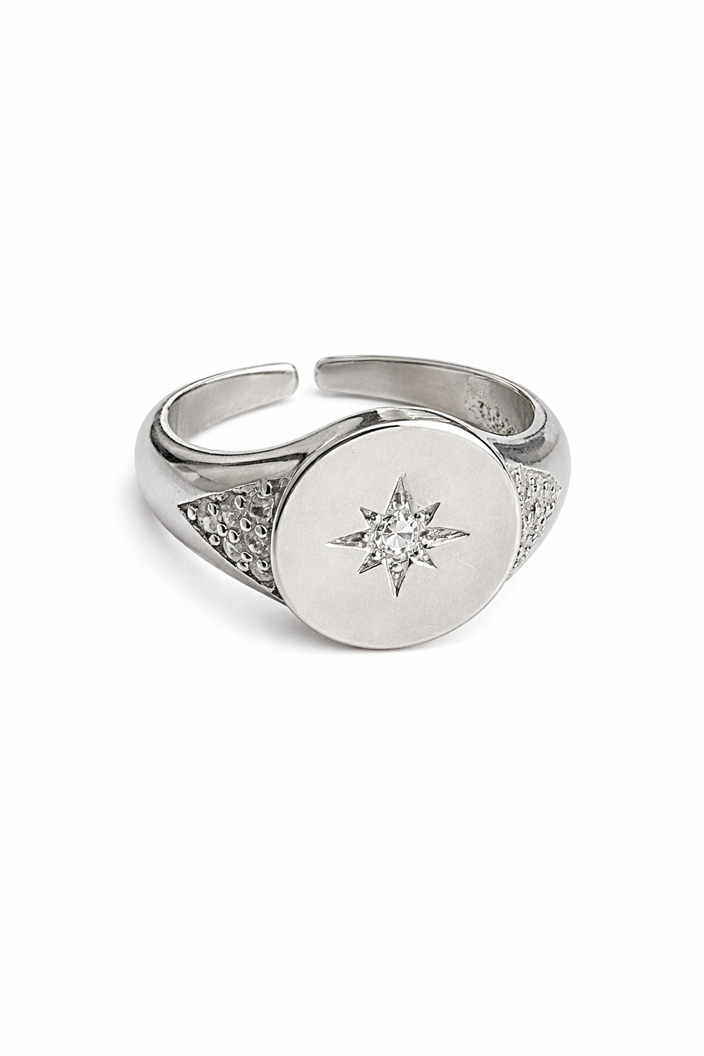Anel banhado a ródio branco, com detalhe zirconia centralizada.
