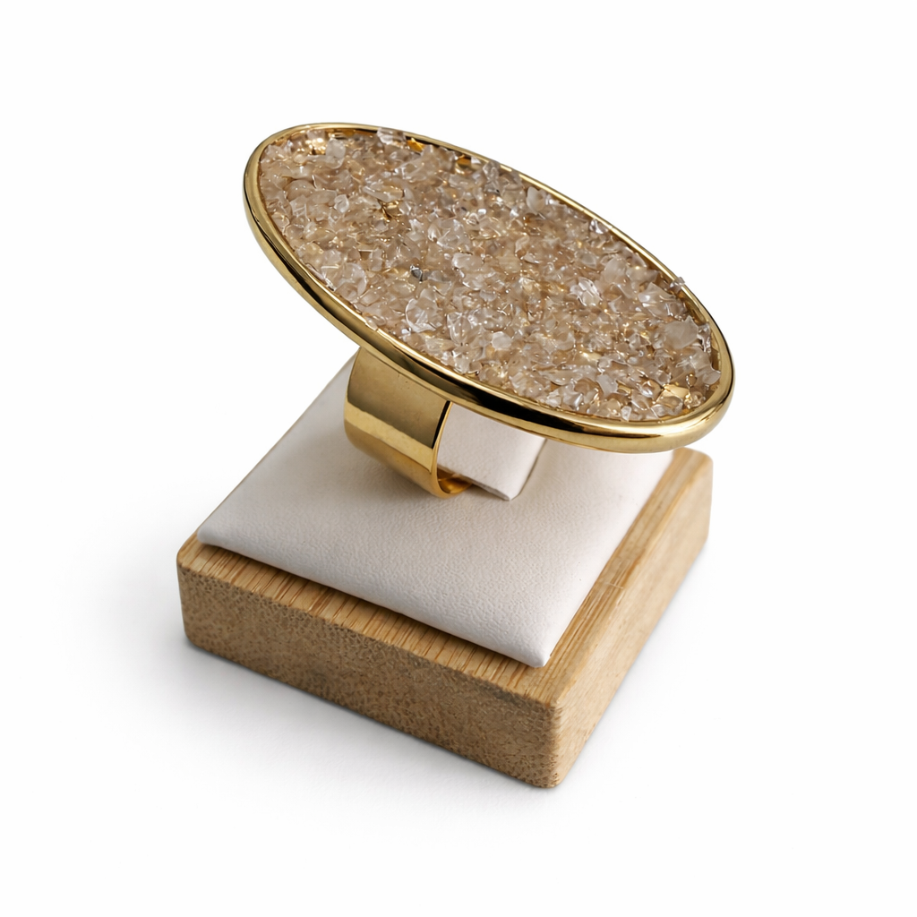 Anel dourado banhado a ouro, com pedra em quartzo cristal.
