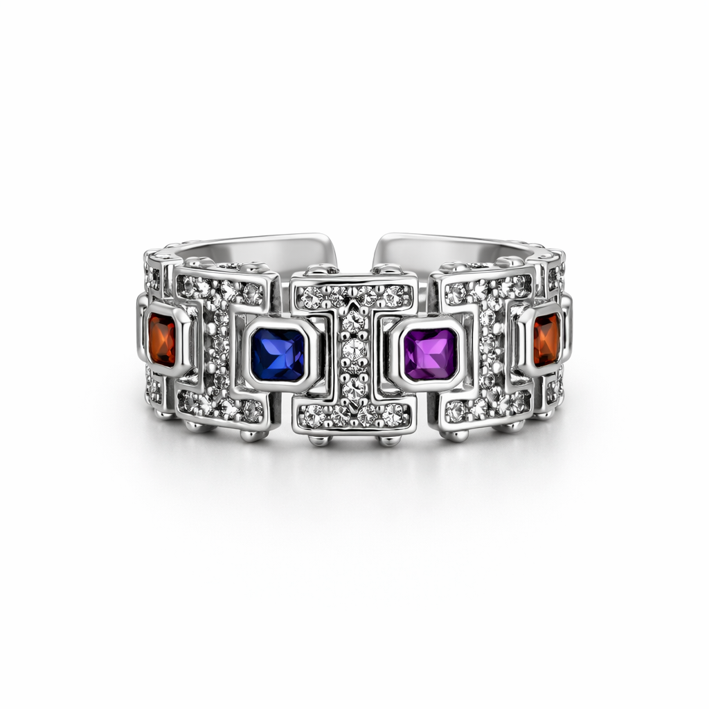 Anel banhado a ródio branco, com zirconias na cor colorida.