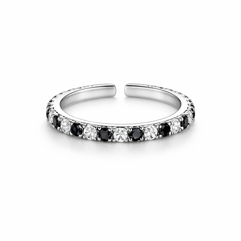 Anel banhado em ródio branco, com zirconias na cor cristal e preto.