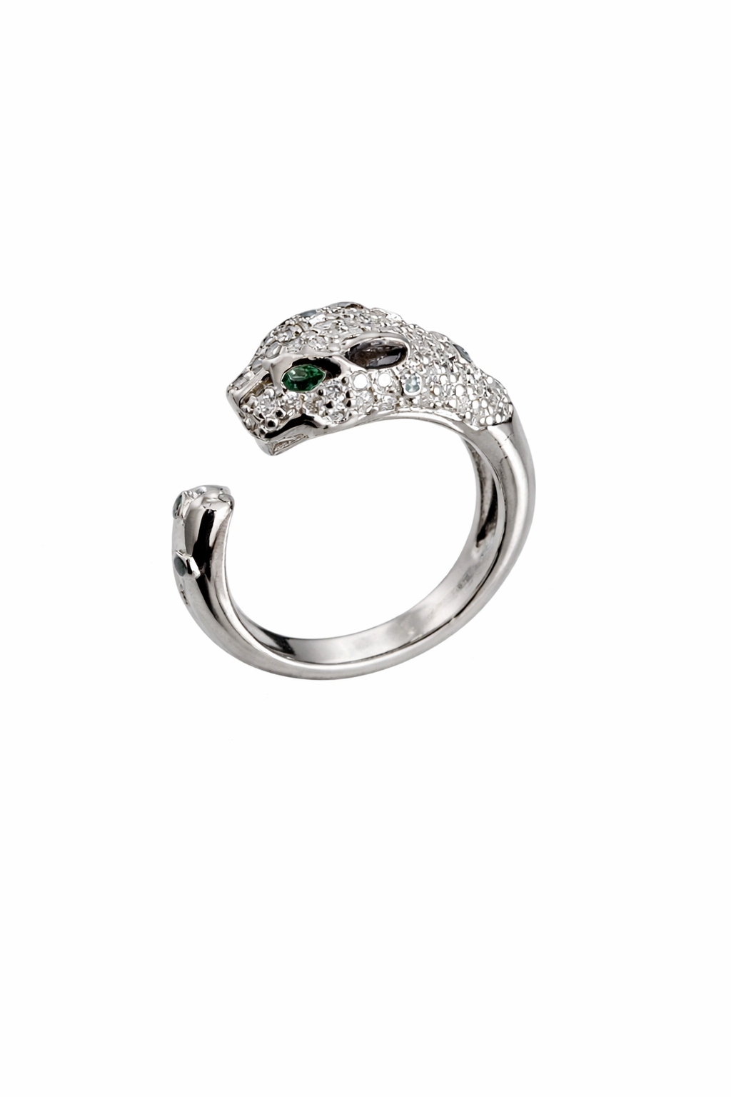 Anel pantera, banhado a ródio branco, com detalhes em microzirconias.