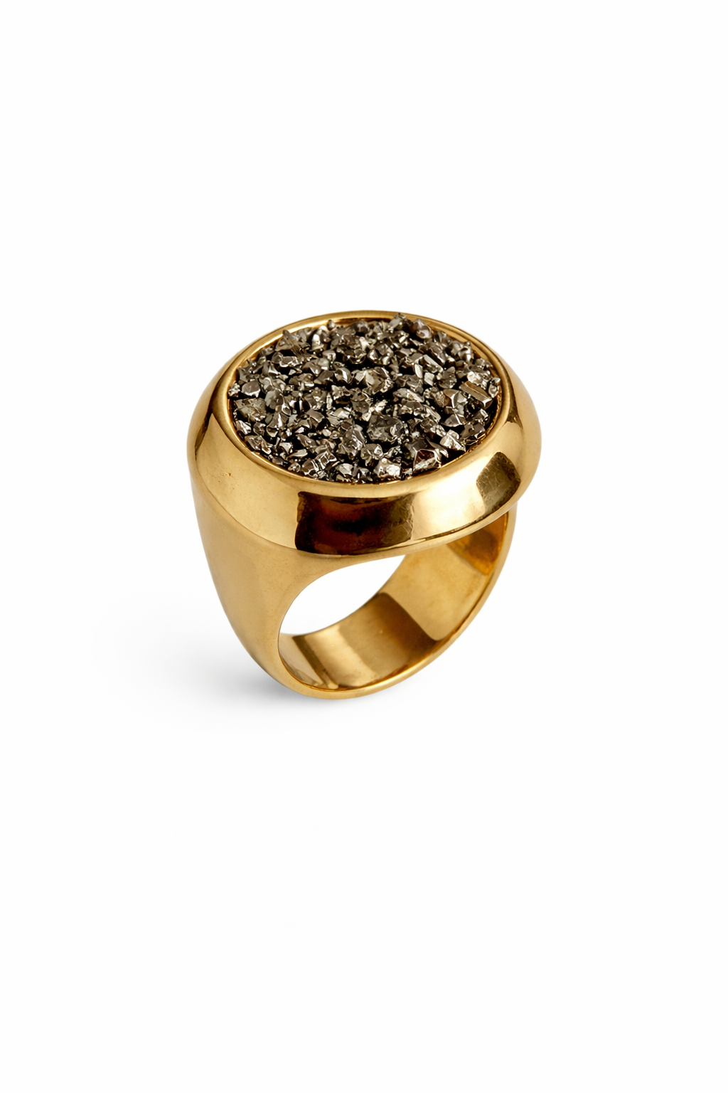 Anel dourado, banhado a ouro, com pedra pirita.