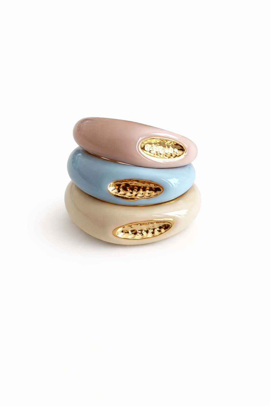 Anel triplo banhado a ouro, resinado em bege, branco e azul clarinho