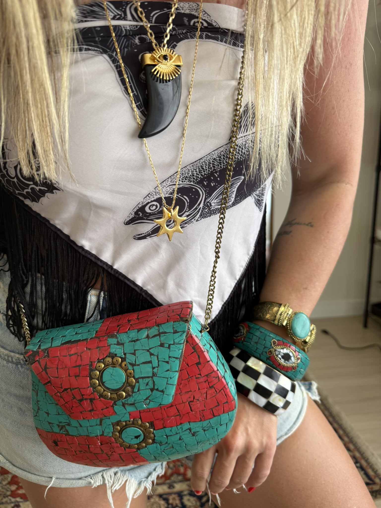 Bolsa Indiana nas cores Vermelha e Turquesa, com design artesanal rico em detalhes e estilo étnico marcante. Ideal para quem gosta de peças boho e com estilo.