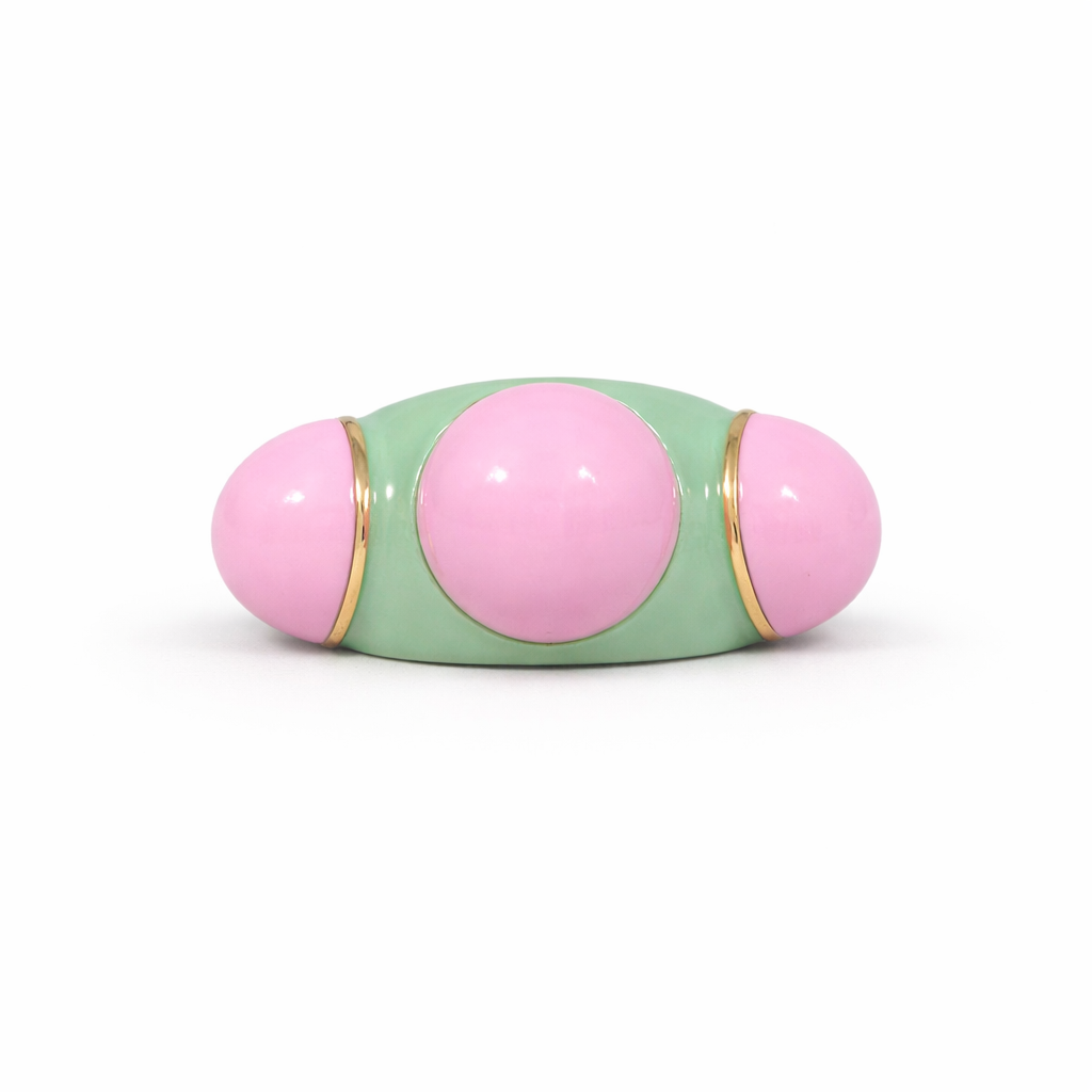 Bracelete dourado banhado a ouro, resinado em rosa e verde.