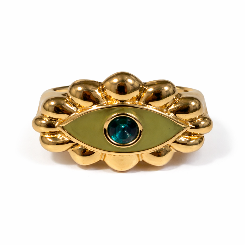 Bracelete dourado banhado a ouro, com resina na cor verde e zircônia na cor verde
