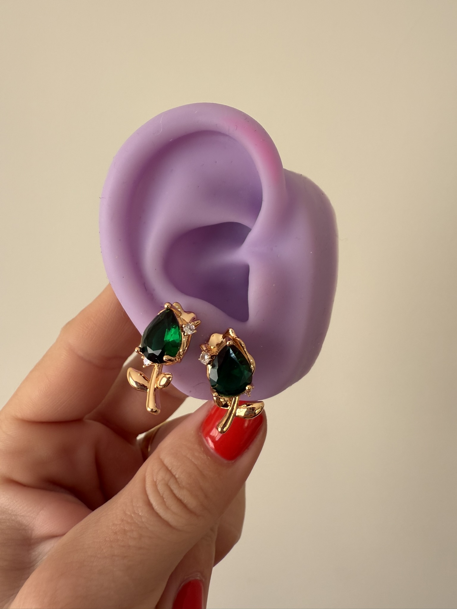Brinco dourado, banhado a ouro, com pedra zirconias na cor verde.