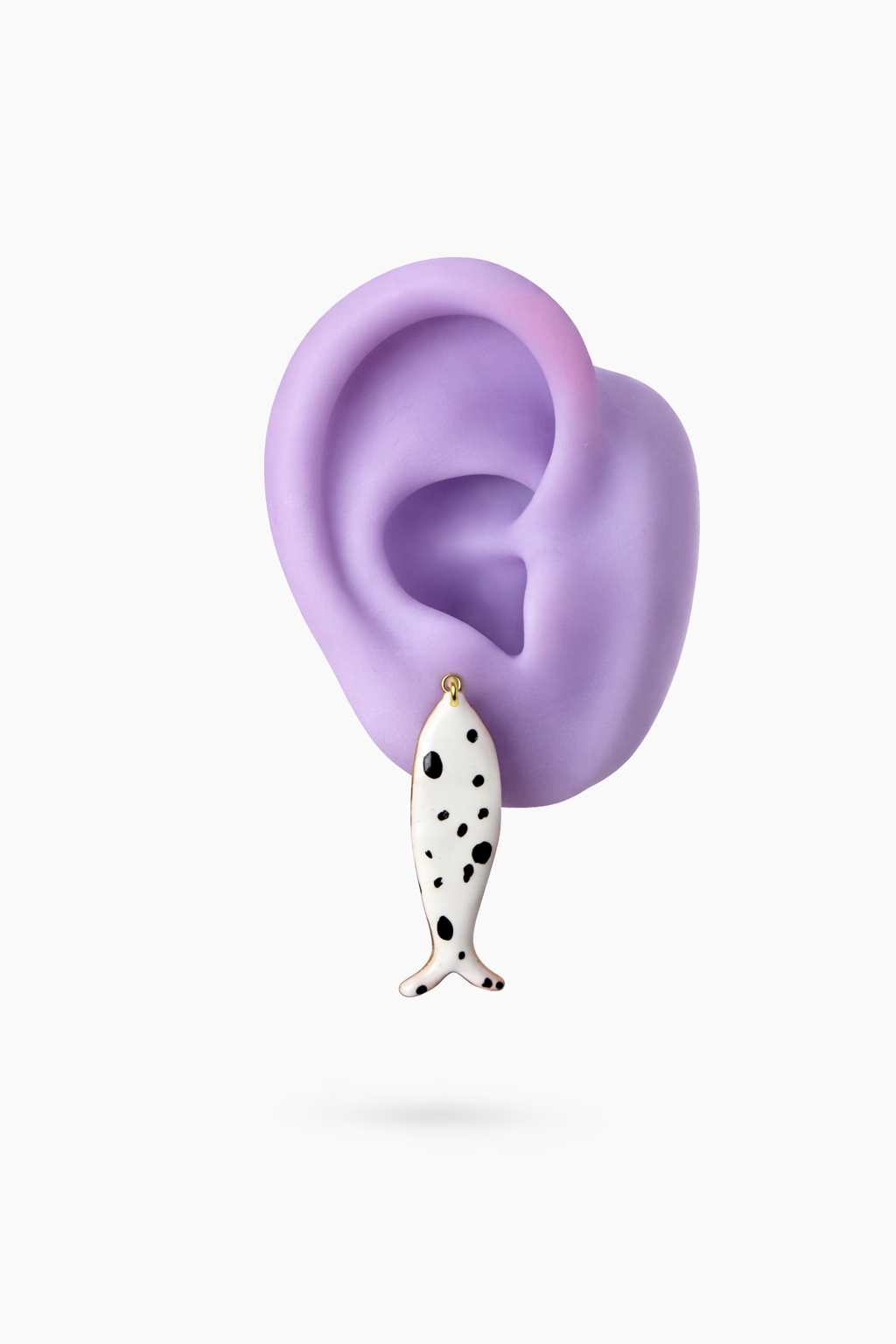 Brinco banhado a ouro, com peixe resinado na cor branco com bolinhas pretas.