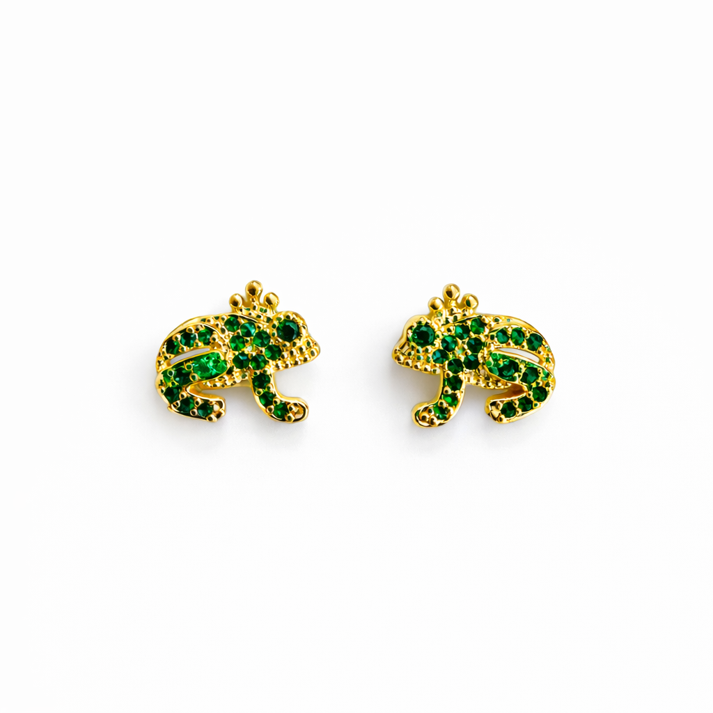 Brinco sapinho banhado a ouro, com zirconias na cor verde.