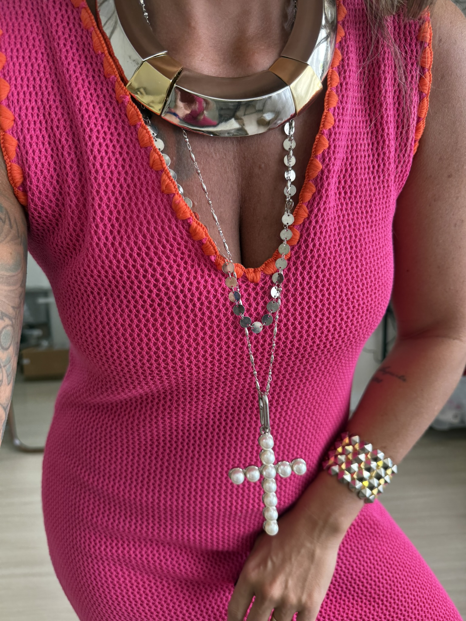 Colar maxi aro com banho duplo, em ouro e ródio