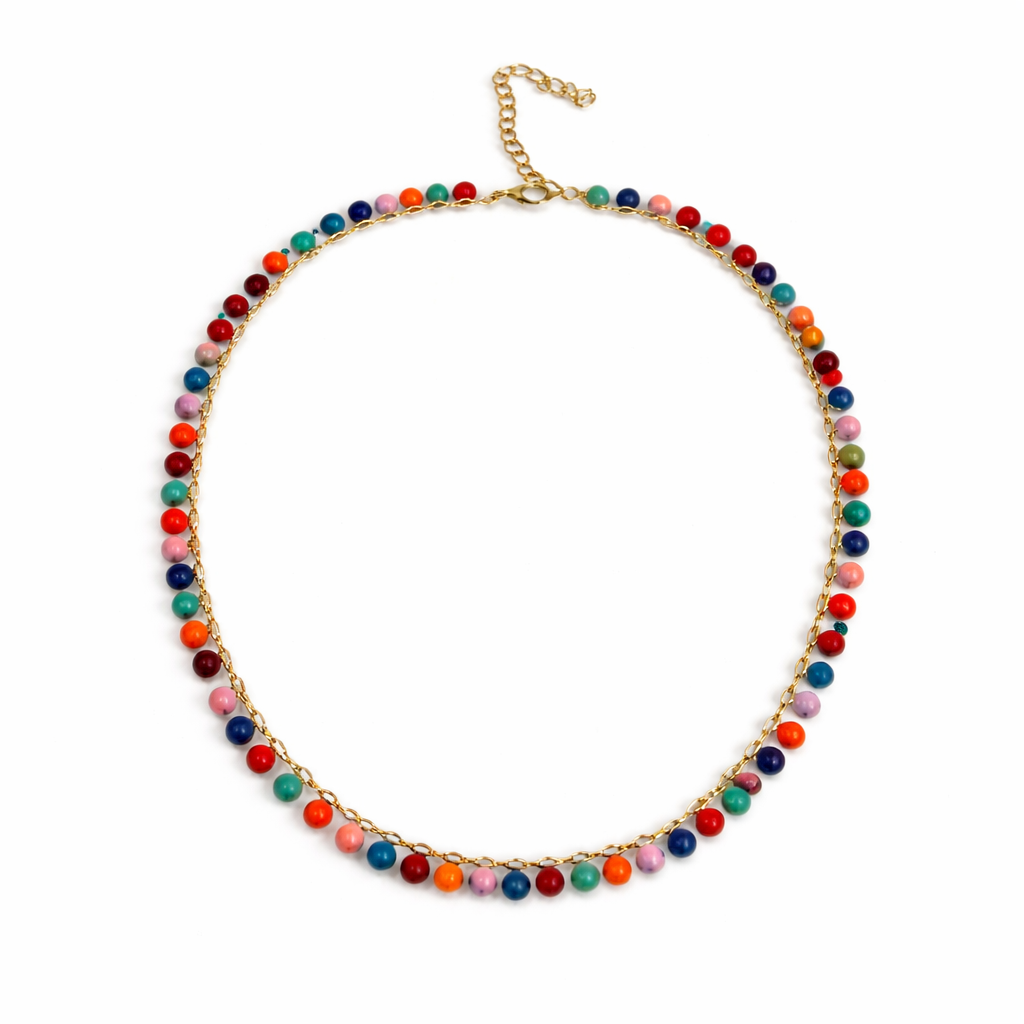 Colar dourado com bolinhas coloridas.