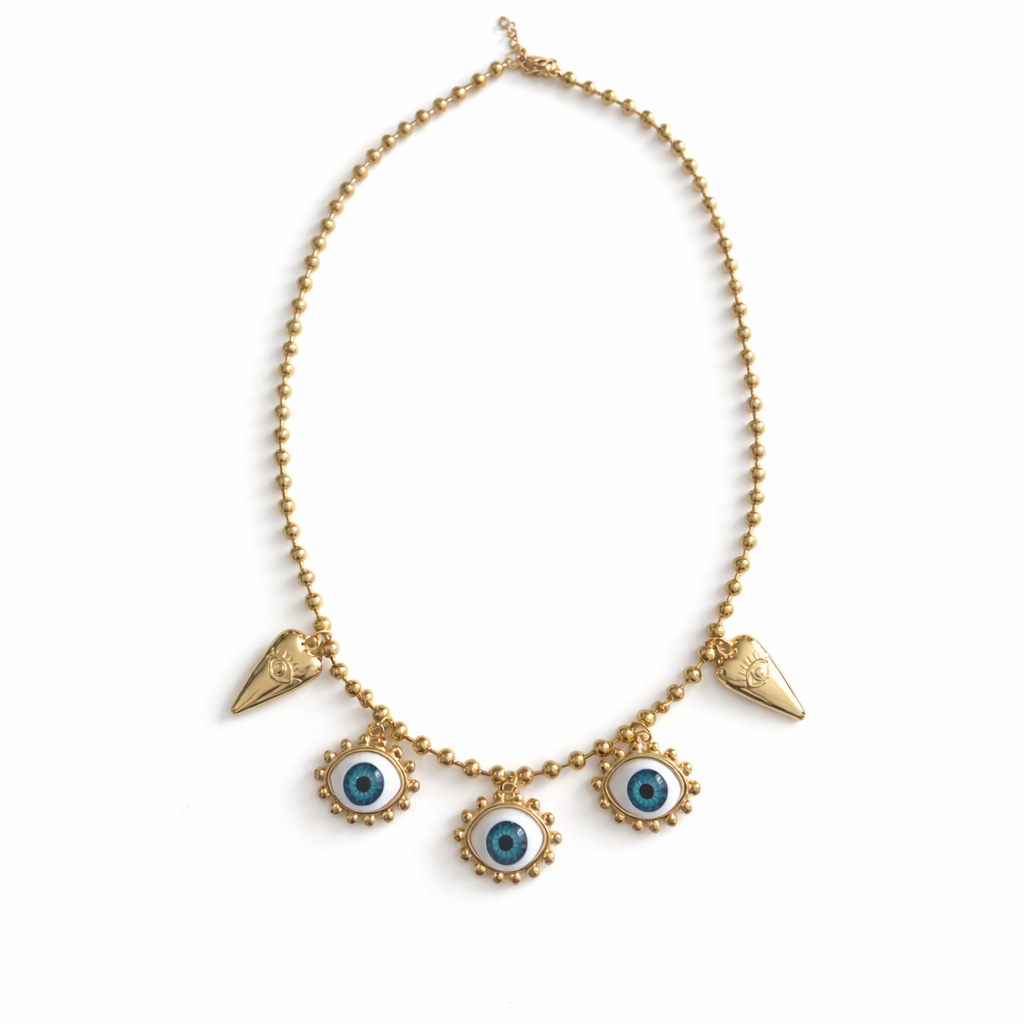 Colar bolinhas olho grego em aço, com pingentinhos olho grego, acompanha brinco de bolinha dourada tb.