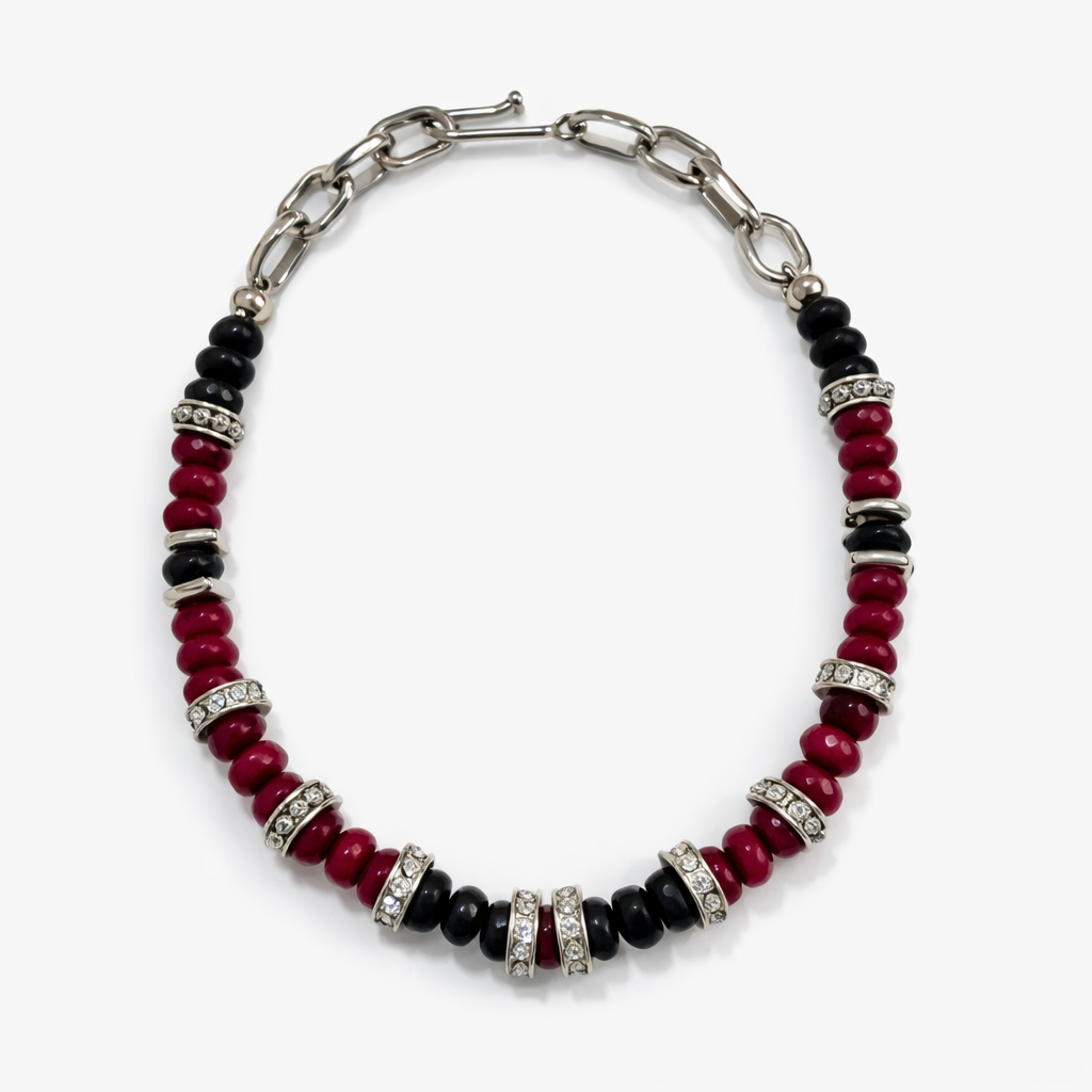 Colar elegante com contas em tons de cereja e preto, intercaladas com separadores metálicos com brilho que adicionam sofisticação à peça. Um acessório versátil, perfeito para complementar diferentes estilos.