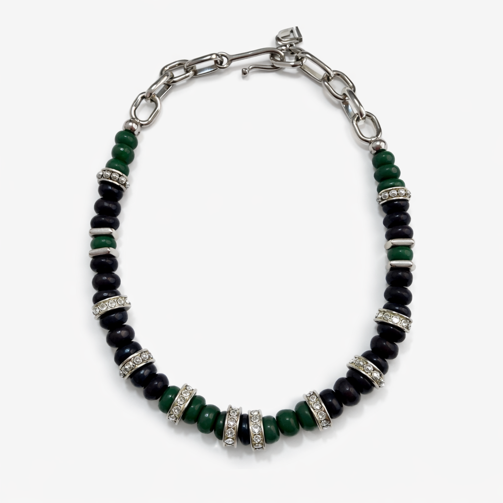 Colar sofisticado composto por delicadas contas em tons de verde e preto, intercaladas com separadores metálicos com brilho que trazem um toque de elegância à peça. O design equilibrado mistura modernidade e sofisticação, criando um acessório versátil que combina tanto com produções casuais quanto com looks mais refinados.
