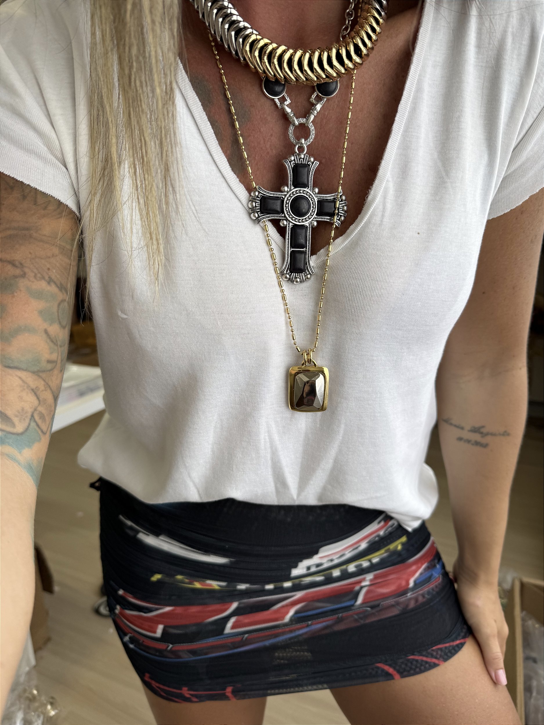 Colar cruz em ródio branco, com resina preta.