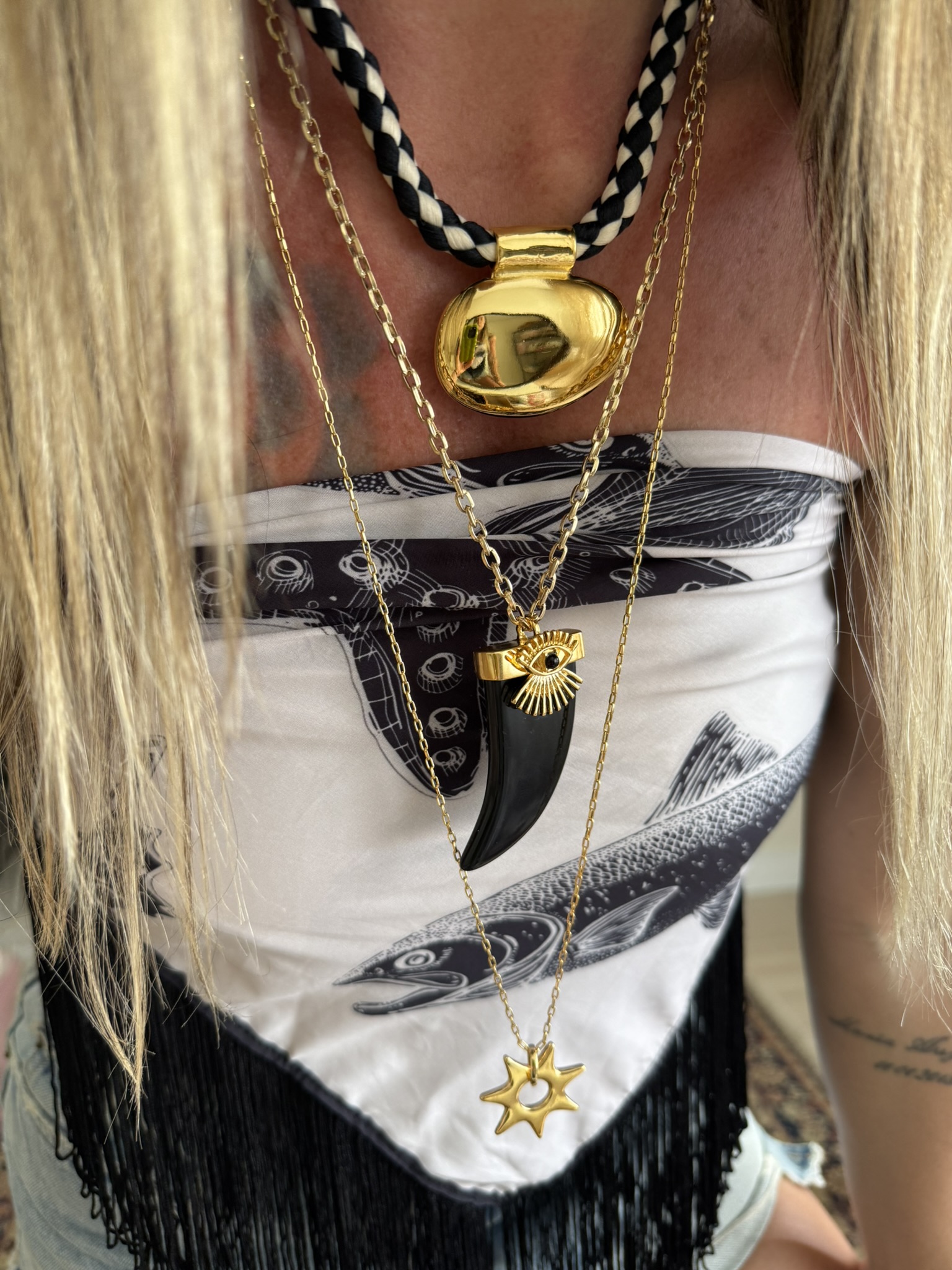 Colar Longo com Dente Preto, cheio de estilo e personalidade. Seu design marcante une o rústico ao moderno, ideal para quem busca um acessório diferenciado e cheio de atitude.