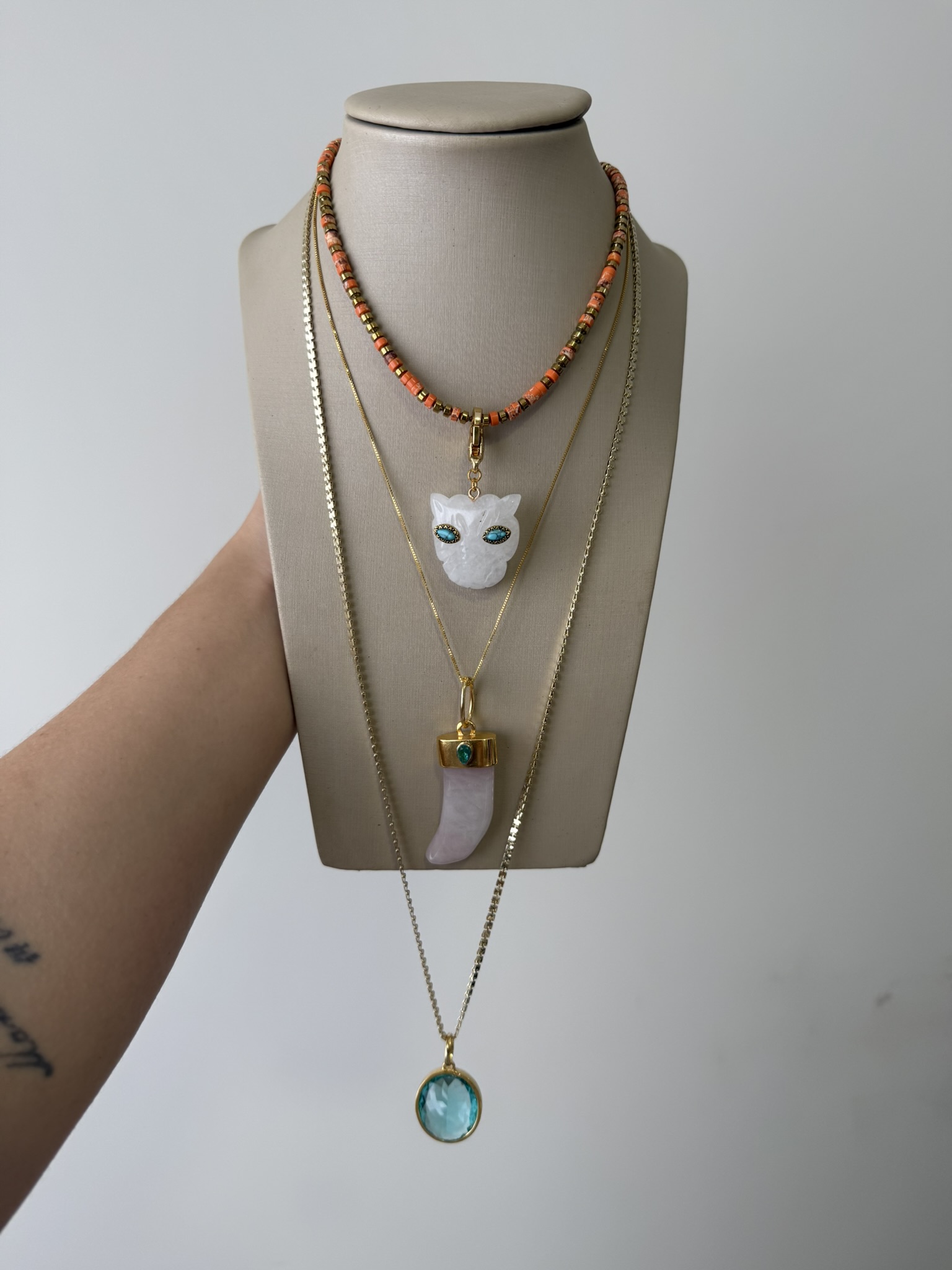 Colar longo, 72 cm, com pedra de vidro na cor azul.