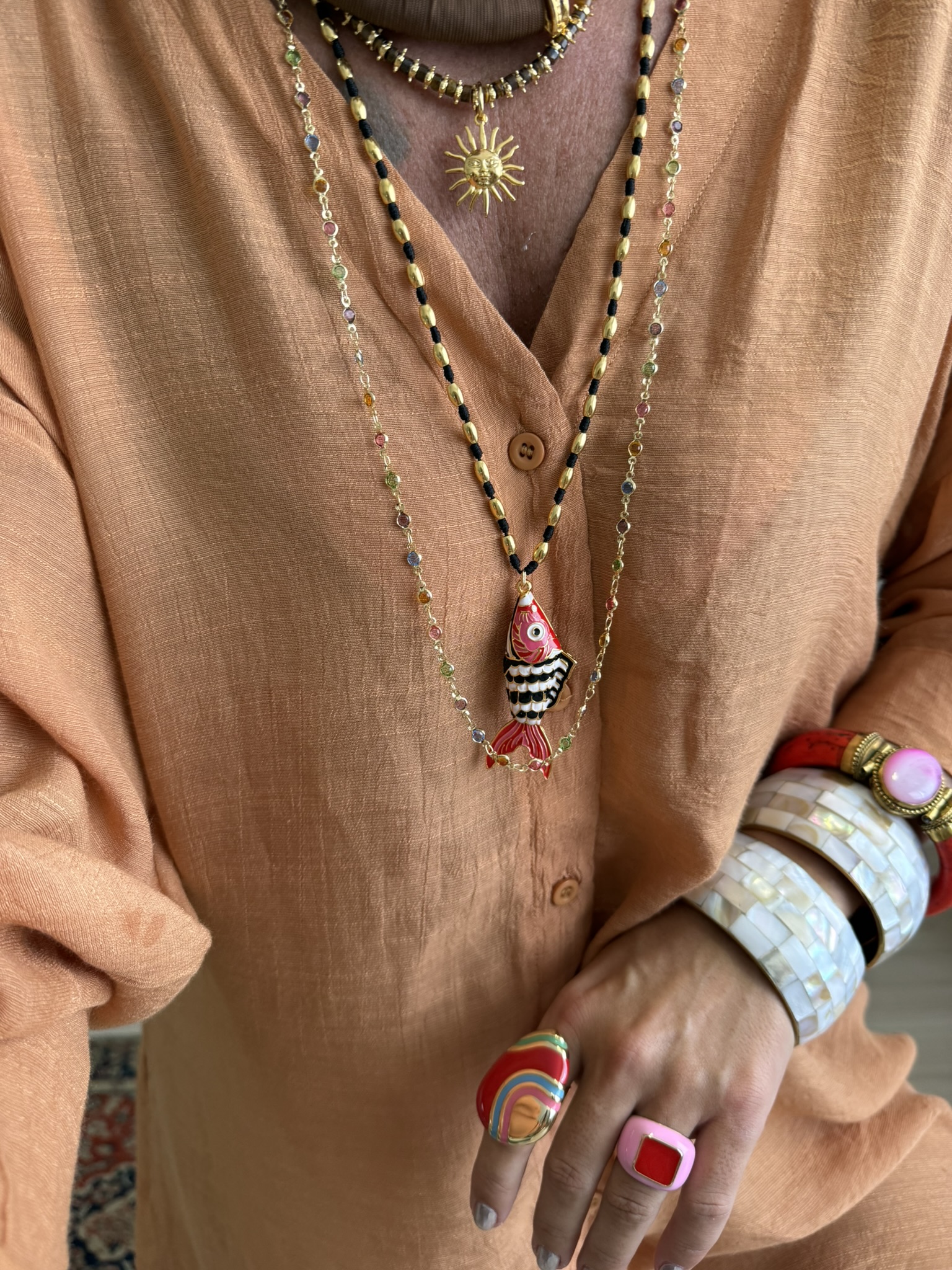 Colar longo em fio com detalhes banhados a ouro, e peixe resinado colorido.