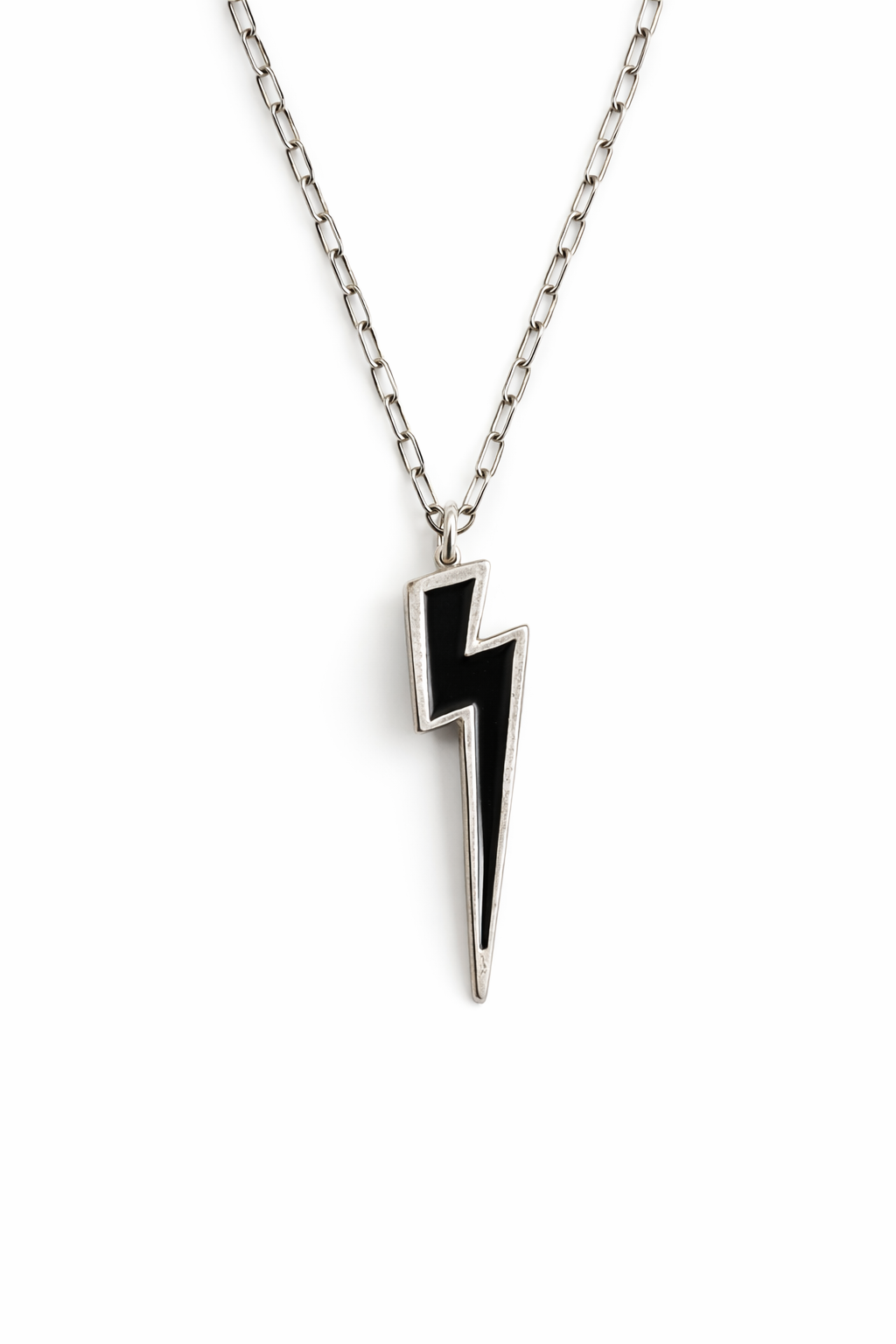 Colar longo banhado em ródio branco, com pingente raio resinado na cor preta.