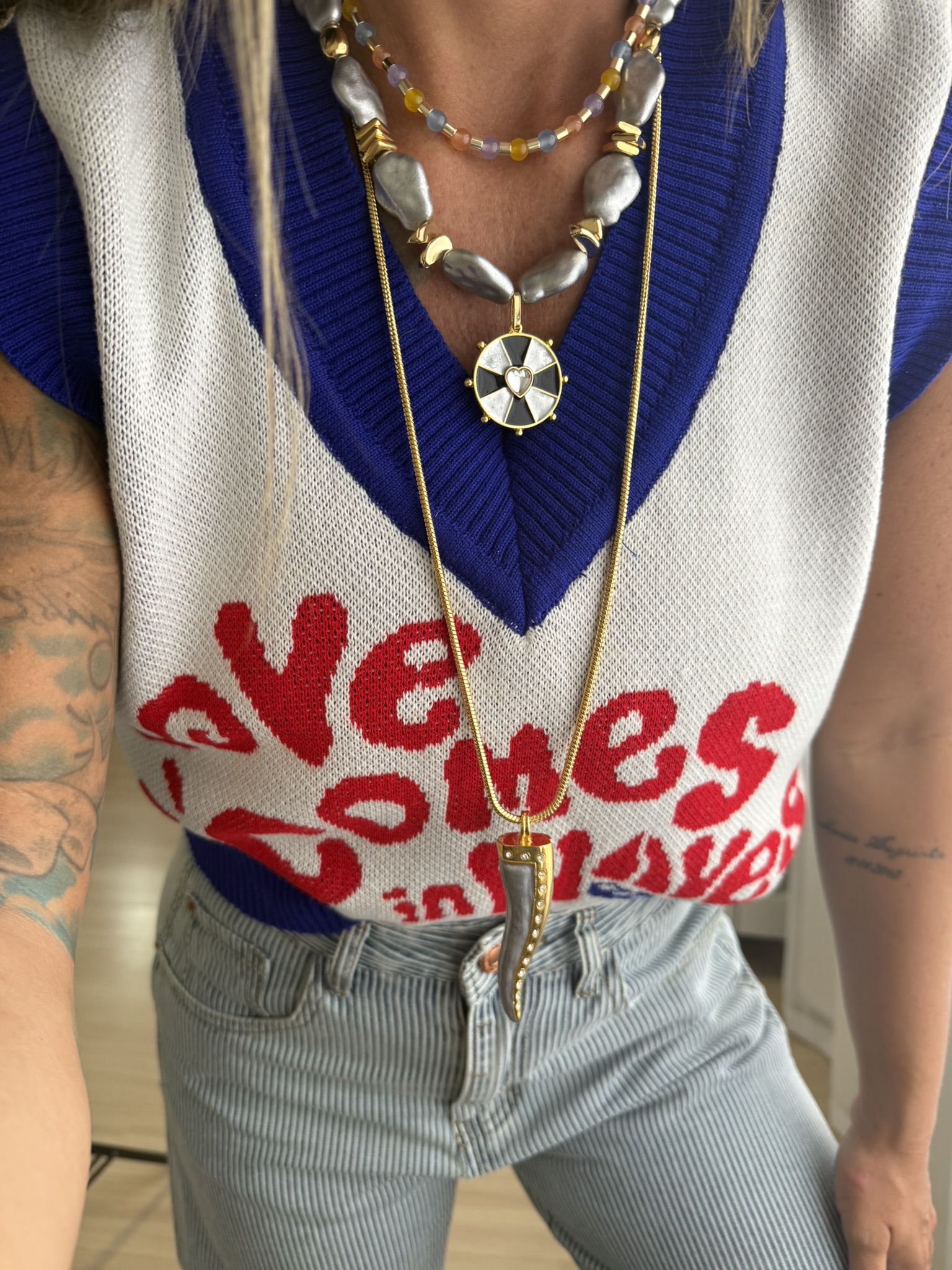 Colar resinado em prata, com detalhes em ouro, e pingente mandala coração em preto e branco.