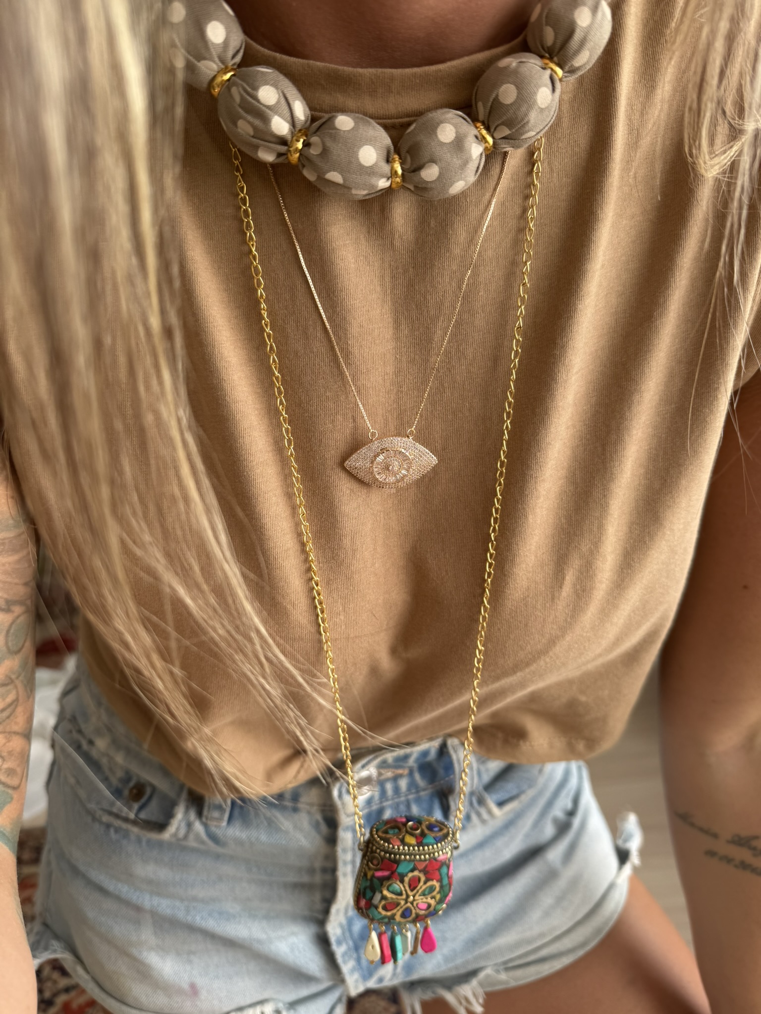 Colar em tecido marrom, com estampa de bolinhas, com detalhes de entremeios dourados.