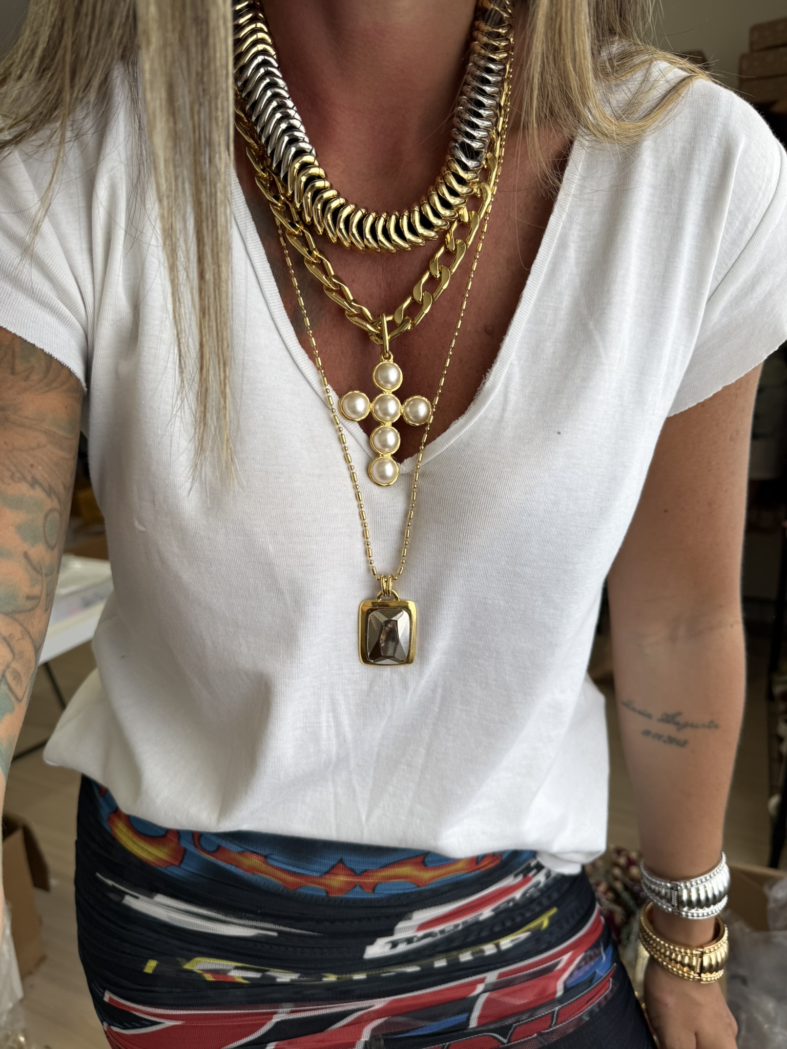 Colar maxi em corda com metal banhado em ouro ou ródio.
