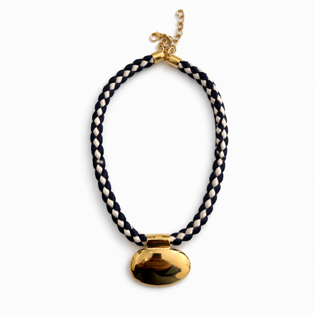 Colar corda preto e branco, com maxi pingente dourado banhado a ouro.
