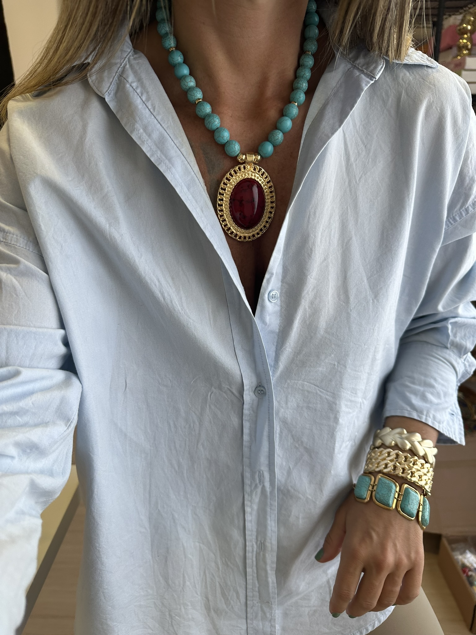 O colar maxi turquesa e marsala é uma peça impactante, perfeita para quem busca ousadia e elegância. Com cores vibrantes, ele transforma qualquer look.