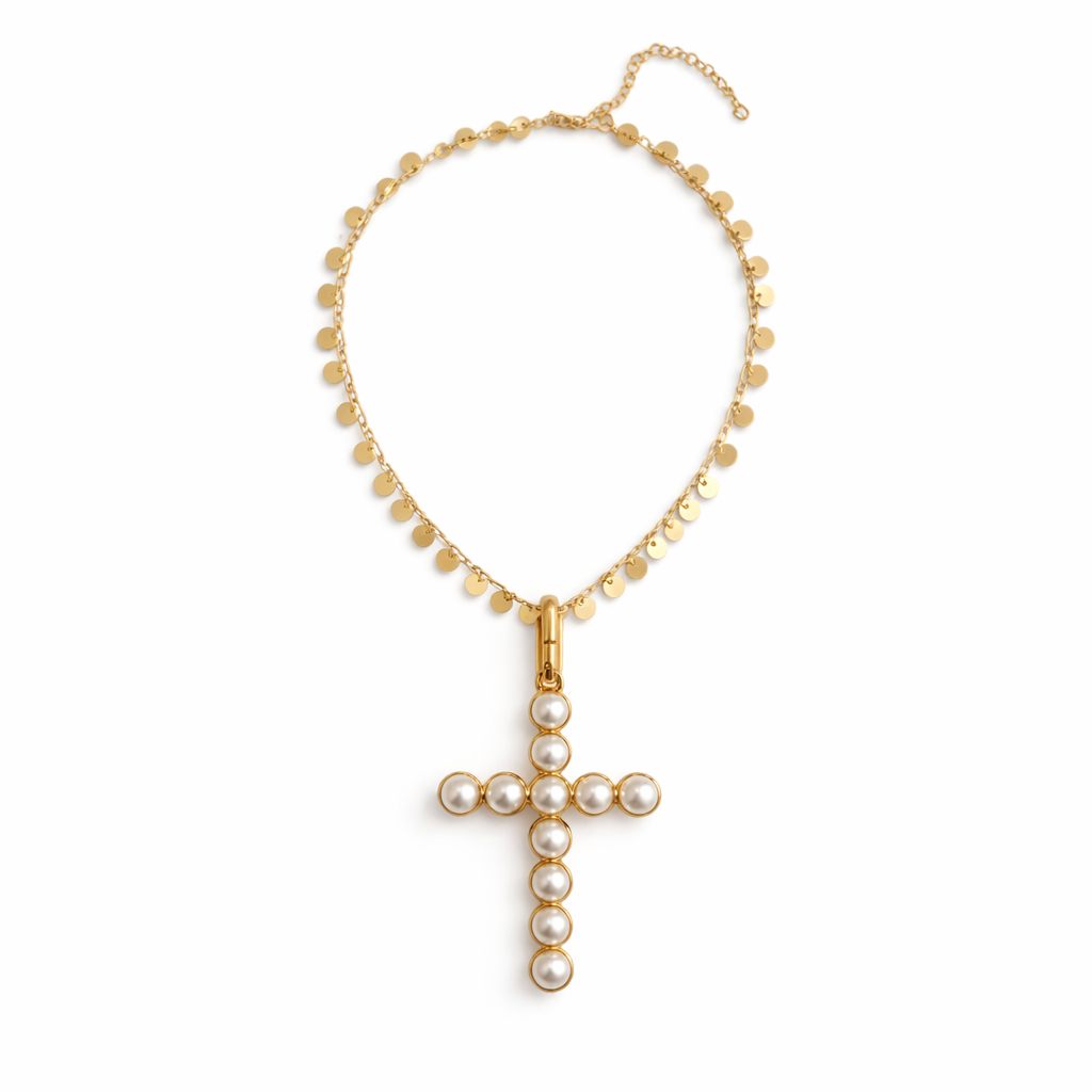 Colar madalhinhas douradas, com pingente cruz em pérolas.
