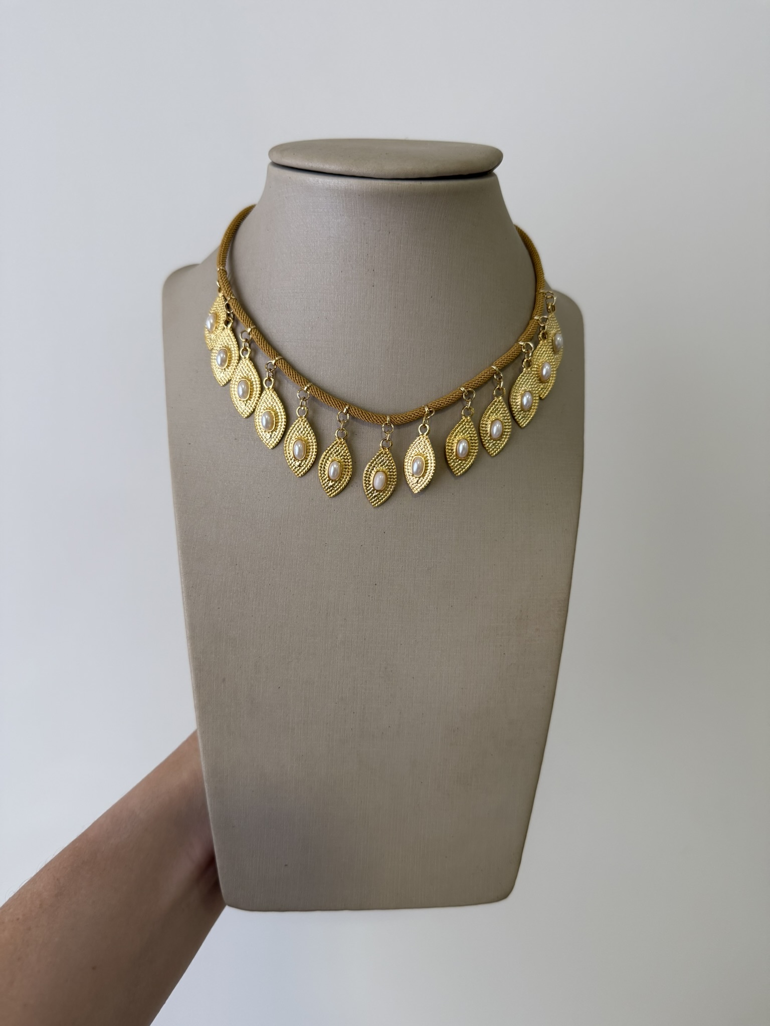 Colar com corda na cor caramelo e pingentes dourados de olho grego.