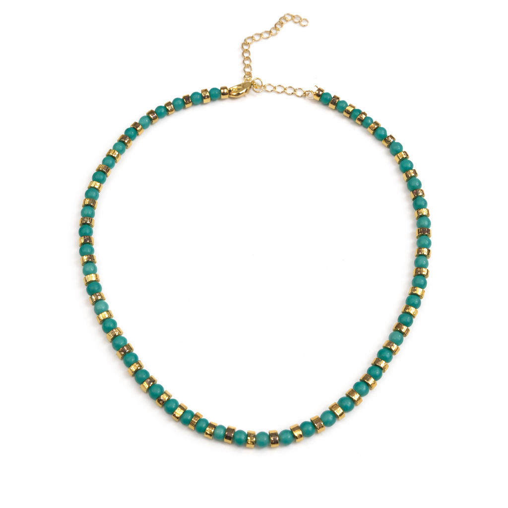 Colar em pedrinhas naturais, com entremeios dourados banhados.
