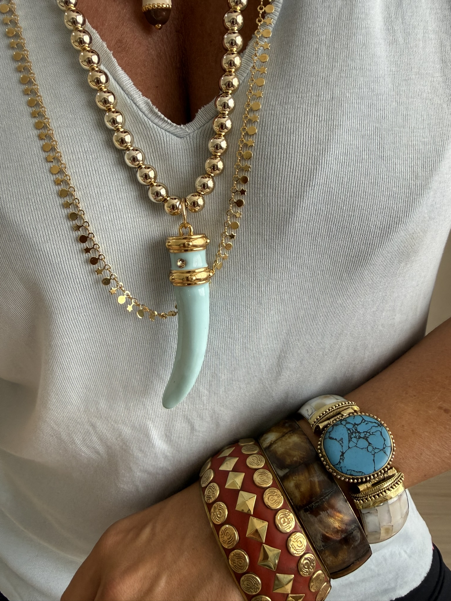 Pingente dente, em metal banhado a ouro, com resina azul claro.
