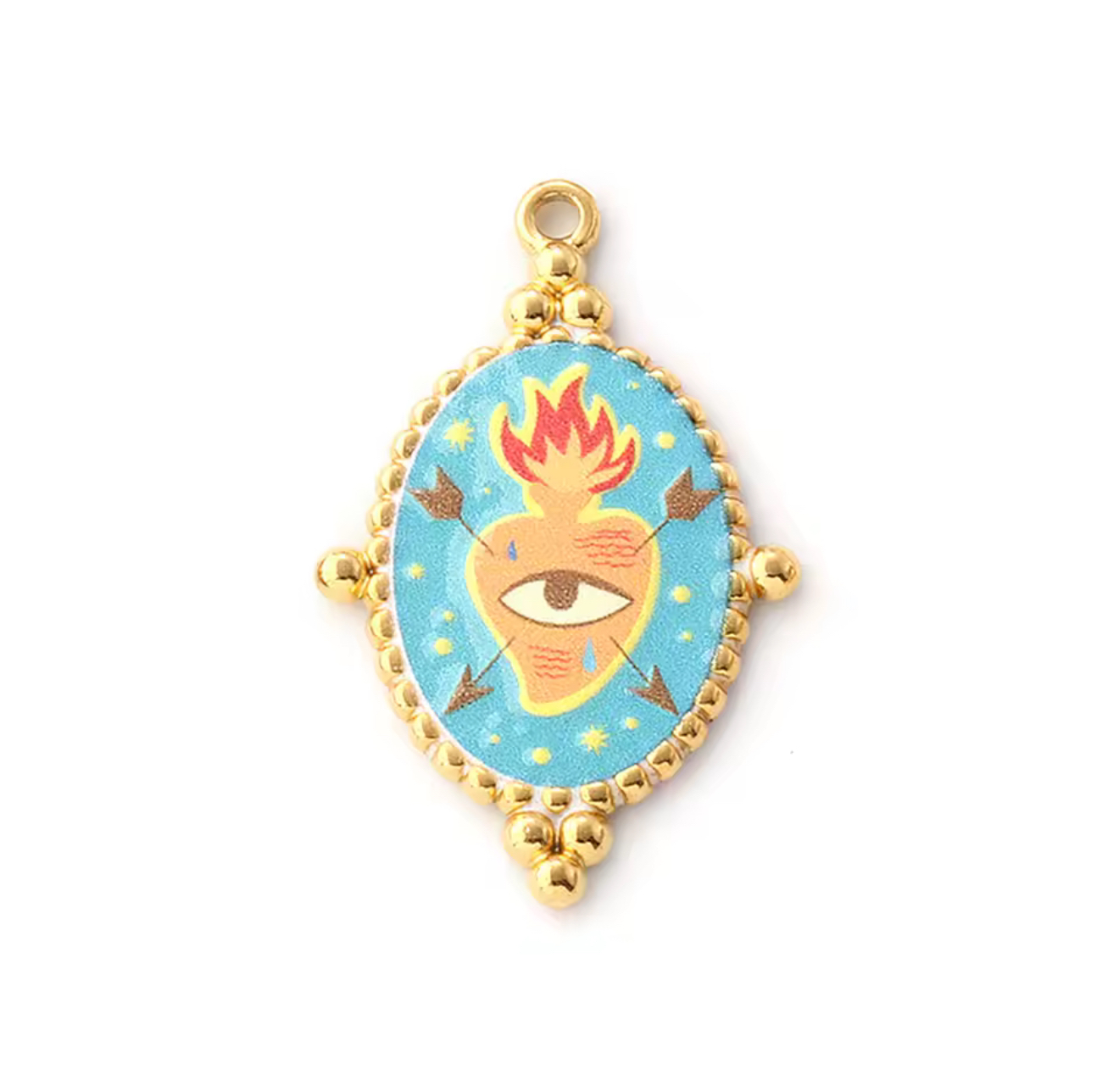 Pingente dourado, banhado a ouro, com imagem de olho grego colorido.
