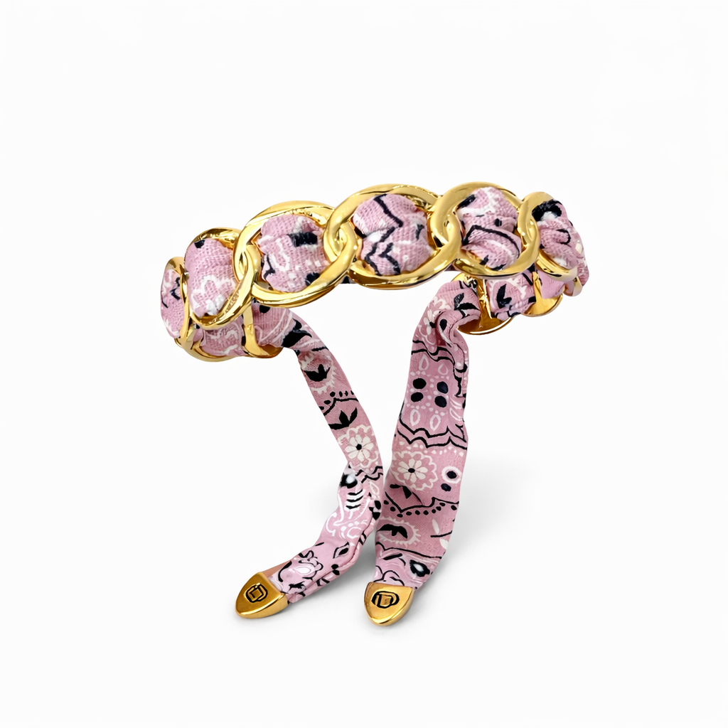 Pulseira de lenco rosinha claro, com detalhes banhados a ouro.