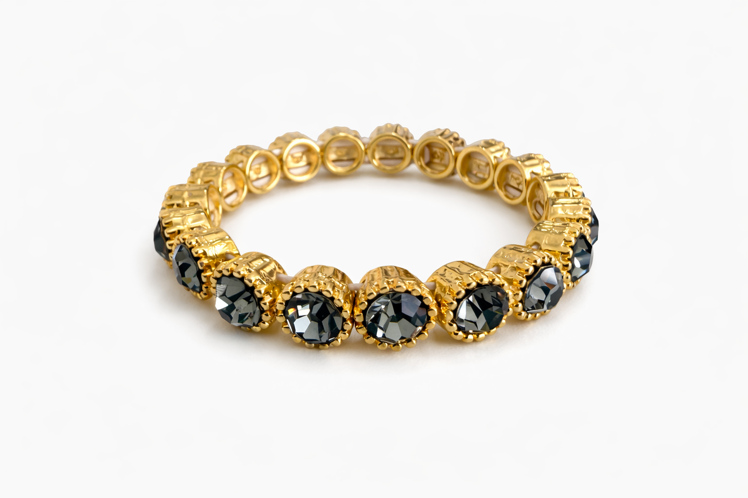 Pulseira elástico dourado, banhada a ouro, com zirconias cinzas.