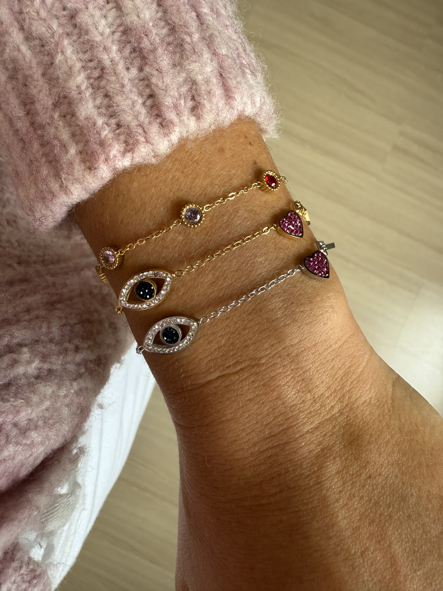 Pulseira em aço de olhinho grego, com detalhes em zirconias coloridas.