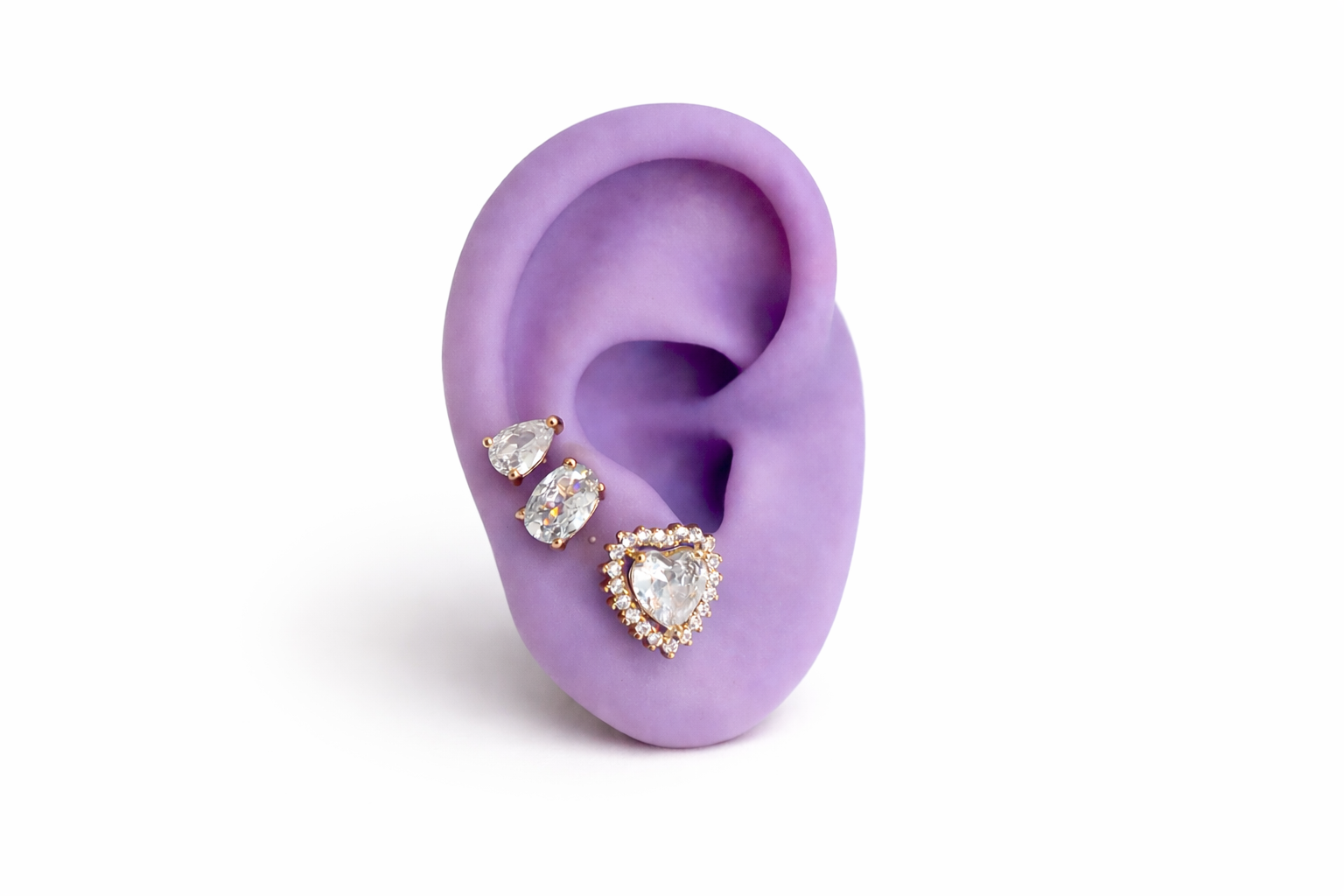 Trio de brincos banhados a ouro, com zirconias na cor cristal.