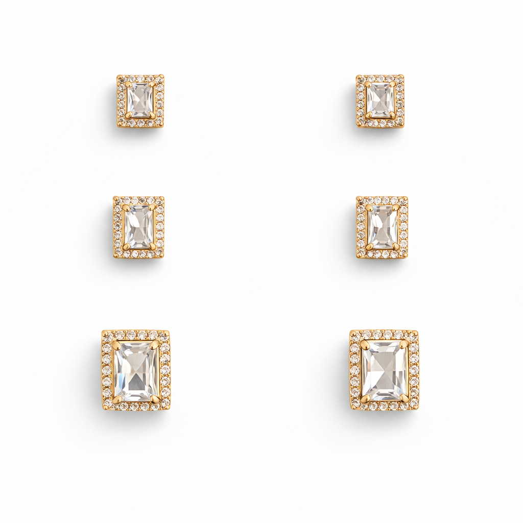 Trio de brincos banhados a ouro com zirconia na cor cristal.
