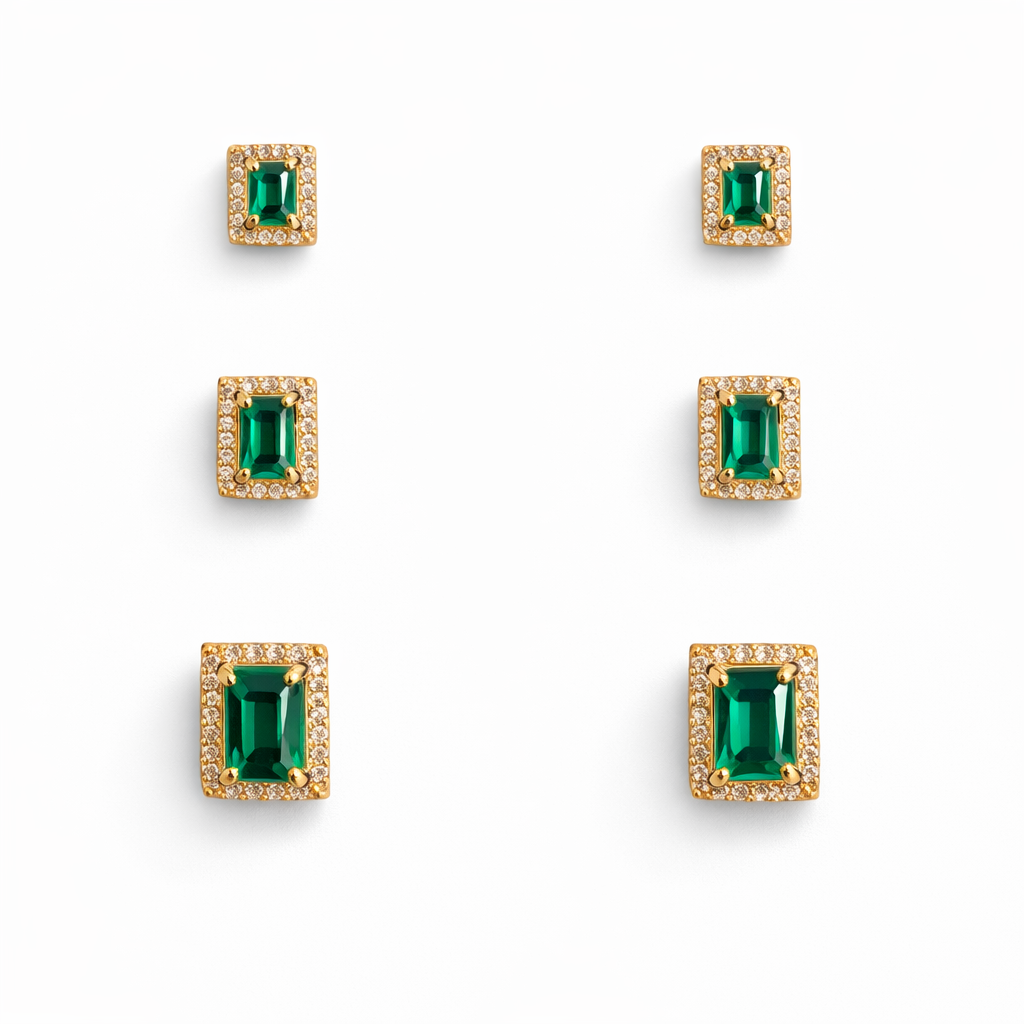 Trio de brincos banhados a ouro 18k com zirconia na cor verde.