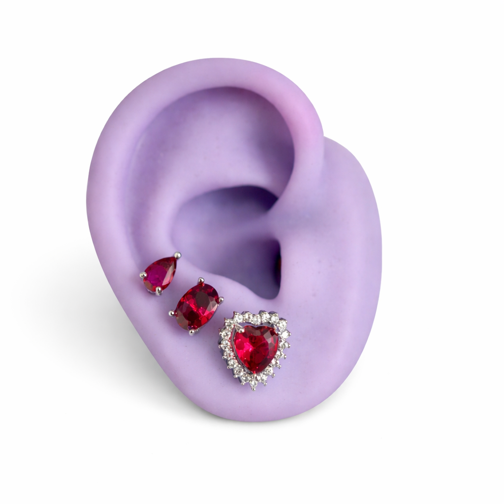 Trio de brincos em ródio branco, com zircônia na cor rubi.